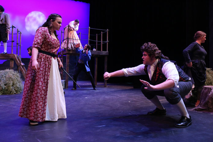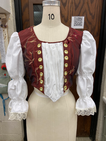 For Moon Over Buffalo, I patterned and built Charolette's dress for the Cyrano de Bergerac section of the play. I first drafted a basic bodice block pattern which was fit in an initial fitting. Although the bodice appears to have a blouse underneath, it is actually all one piece with a faux gathered blouse flatlined to the bodice lining, and puff sleeves attached. The skirt is made of large rectangular panels gathered onto grosgrain ribbon, and cross-stitched onto the bodice.