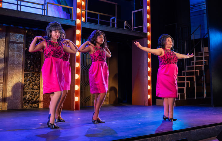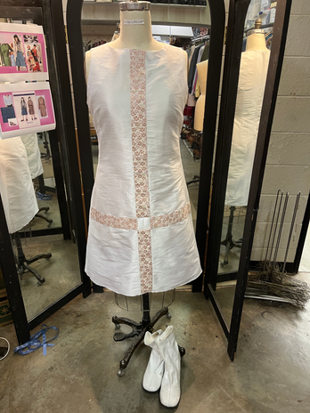For this production, I built and altered dresses for the Shirelle's and Chiffon's numbers. The pink and sequin dresses were finished with a center back lap zipper and bias binding on neckline and armsceye. The shift dresses for the Chiffon's were cut from a commercial pattern, and during the fitting process we discovered that they were all too snug in the hips. I assisted in the fittings, and was able to insert triangle shaped panels into the side seams, and fix the fit of the dresses.